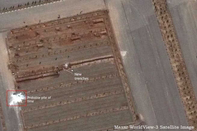 Imagem de satélite de meados de março de 2020 revela o que parecem ser covas coletivas no cemitério Beheshte Masoumeh, em Qom (Irã), para vítimas do coronavírus. Ao lado, provável pilha de cal, que tem sido usado nesses enterros