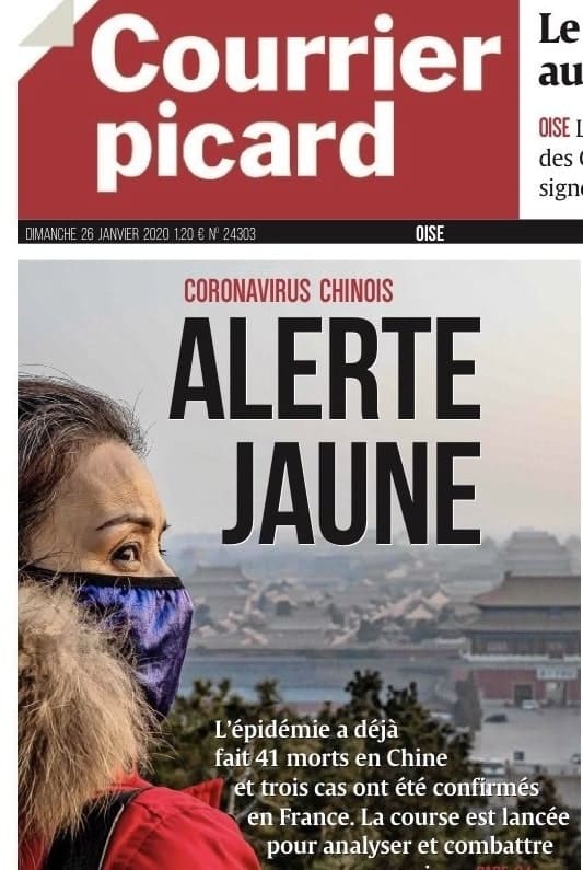 A capa do jornal francês Courrier picard de 26 de janeiro lança o estigma sobre os chineses: “Alerta amarelo” e “coronavírus chinês”