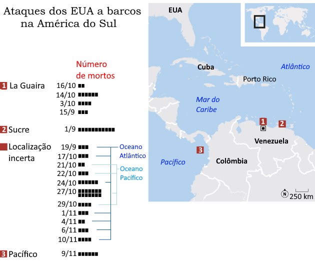 As embarcações destruídas podem ou não estar ligadas ao narcotráfico. Pescadores do litoral da Venezuela, da Colômbia e do Equador são recrutados pelos traficantes para o serviço de transporte de drogas. Mas são, no máximo, soldados rasos dos cartéis do tráfico. E, de mais a mais, a maior parte do fentanyl chega aos EUA por via terrestre, através da fronteira mexicana, e a maior parte da cocaína, pelo Pacífico, não pelo Caribe, onde se concentram os mais numerosos bombardeios americanos.